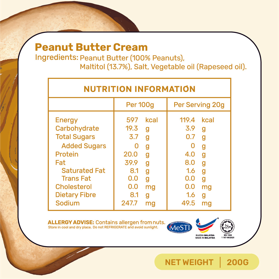 فول سوداني محمّص فاخر، ممزوج في كريمة ناعمة مع لمسة متوازنة تمامًا. غني بالنكهة الجوزية وكريمي بشكل لا يقاوم، مثالي كدهن، أو كصوص للتغميس، أو كإضافة فاخرة إلى وجباتك الخفيفة وحلوياتك المفضلة. تم تحسين طريقة التحضير بعناية للحفاظ على الرائحة الطبيعية والطعم الغني الكامل للفول السوداني.
